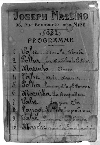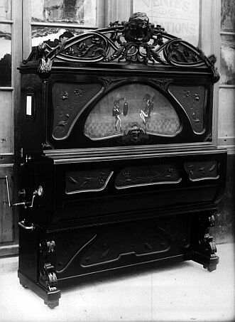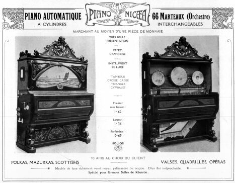 The automatic piano-organs are entirely adapted to customers'taste: choice of the melodies (polka, waltz, fox-trot, tango, one-step, charleston...), which will change according to fashion (14); style and decoration of furniture, with carved fronton, poker-works, gildings, painted panels (casino of the "Jetée-promenade", country or sea landscapes, groups of black jazzmen...). The best decoration occurred when the "Art Nouveau" style, made popular by Nancy School of artists, was adopted, at a moment of high fashion in France for the "Style Nouille". They are sold, from 1911, under the trademark "PIANO NICÆA", registered by Nallino family.