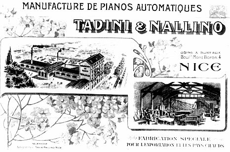 Once finished the association with Tadini, the factory changes its name for "Société Niçoise de Pianos Automatiques". Its activity stops at the beginning of World War I. During the War, the factory premises are used for the quartering of troops (15). After the war, Joseph arises to a very sad conclusion: with broken machines and toolings, burnt precious woods and no financial indemnity, the factory will not open again. All the activity is transferred to the 36, Bonaparte Street, where Joseph is associated with five of his sons (16), Charles, Etienne, Joseph, Jean and Armand.